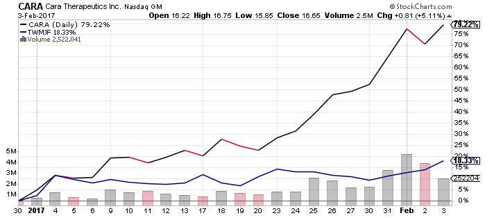 At the top of the list, U.S. based cannabis biotech Cara Therapeutics (NASDAQ: CARA) – shares are up 79% in just five weeks.